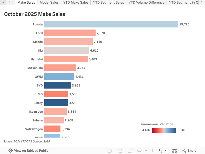 Rounding out the top five were the Ford Everest (2435) and Hyundai Kona (2057), behind which came the Chery Tiggo 4 (1975), Isuzu D-MAX (1896), Mazda CX-5 (1813), Mitsubishi Triton (1770) and MG ZS (1743).